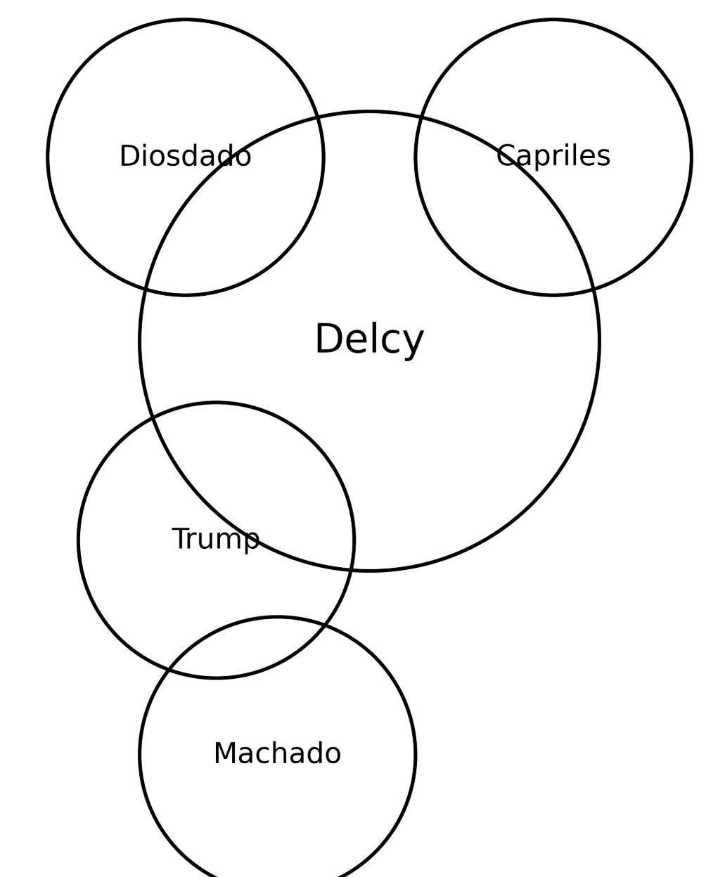 That’s one person promising to collaborate with Trump but not Delcy. One person collaborating with Delcy but not Trump. And a third crazy and disruptive wild card that is aligned with Trump but not necessarily anyone else. It’s a coordination problem, along with the usual opposition infighting and competition. Add in Diosdado and others, and it’s a Venn Diagram with few overlaps. Here is another way to visualize it: